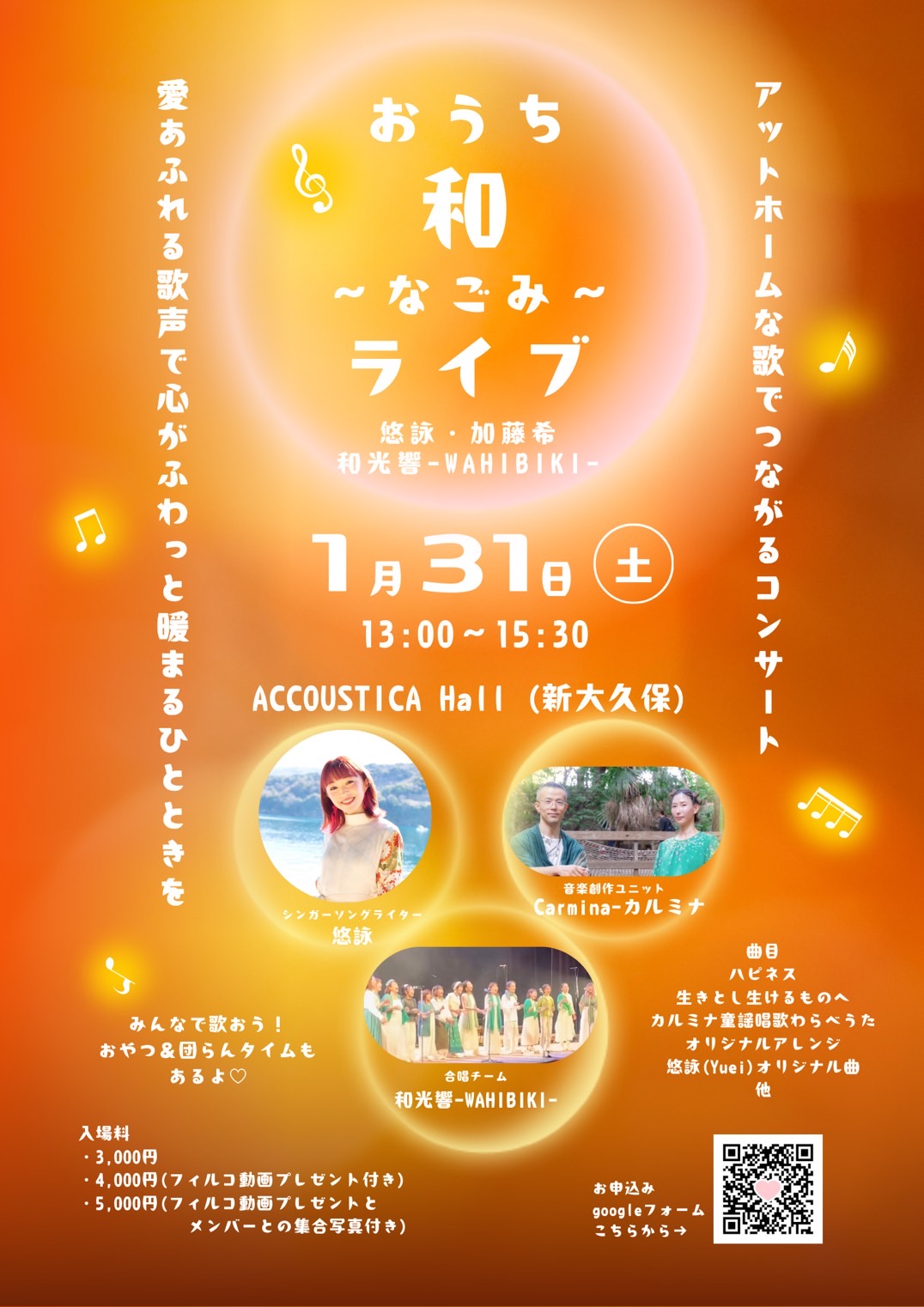 新大久保駅から歩いて10分弱の音楽ホールにて 合唱チーム「和光響」 シンガーソングライター悠詠 音楽創作ユニット カルミナ が出演するライブイベントが開催されます! カルミナは童謡をオリ